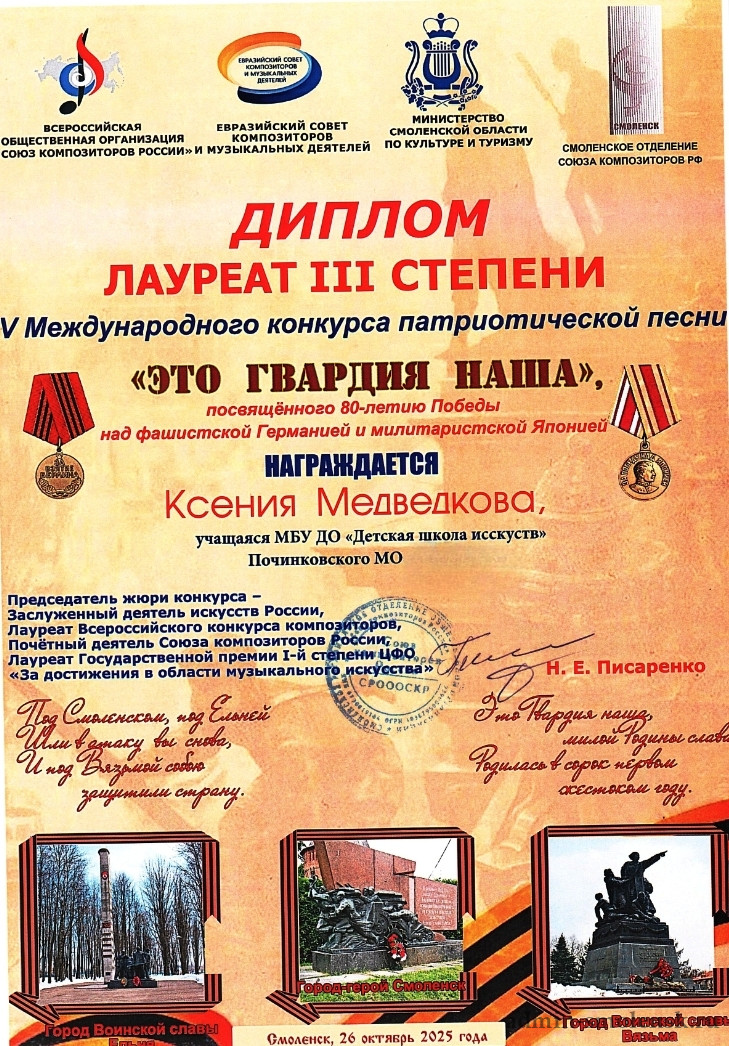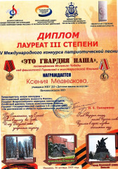 Учащаяся эстрадного отделения ДШИ (д. Плоское) Медведкова Ксения приняла участие в конкурсе и награждена дипломом Лауреата III степени. Подготовила Ксению к выступлению преподаватель Фроленкова Е. В