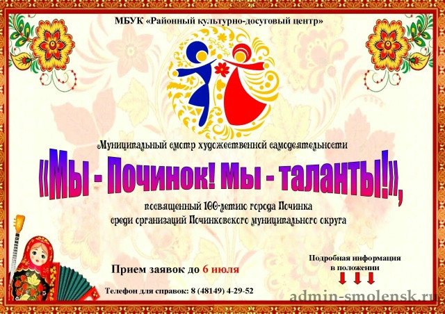 Объявлен конкурс о проведении муниципального смотра художественной самодеятельности «Мы - Починок! Мы - таланты!», посвященного 100-летию города Починка