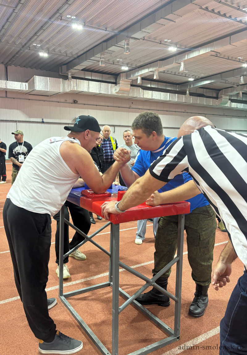 Более ста защитников Родины из Смоленской области продемонстрировали свои спортивные навыки в восьми дисциплинах: баскетболе, настольном теннисе, дартсе, пауэрлифтинге, армспорте, гиревом спорте, пулевой стрельбе и метании ножей.