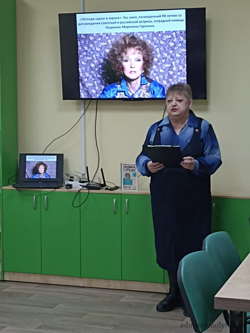12 ноября в литературно-музыкальной гостиной «Вдохновение» центральной районной библиотеки им. В.П. Смирнова прошёл час кино «Легенда сцены и экрана» , посвященный 90-летию со дня рождения известной актрисы театра и кино, эстрадной певицы Людмилы Гурченко.