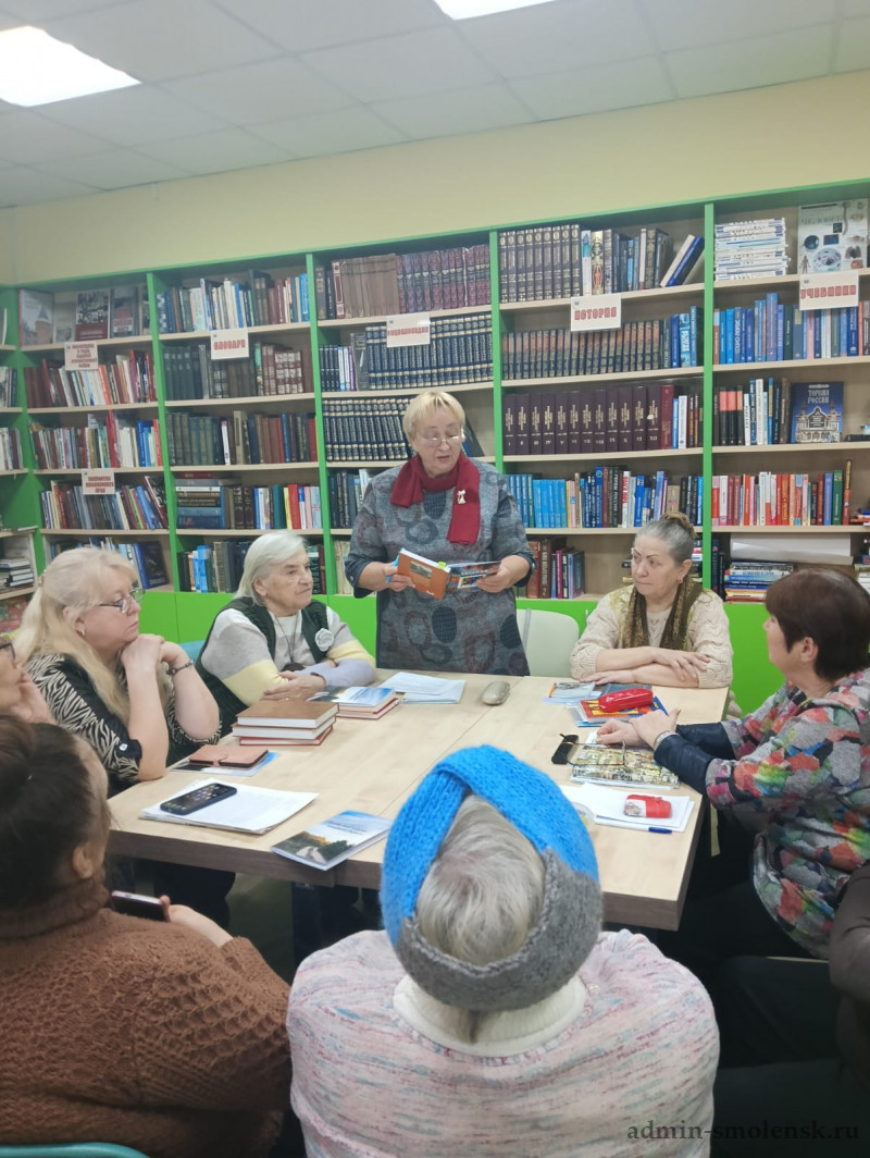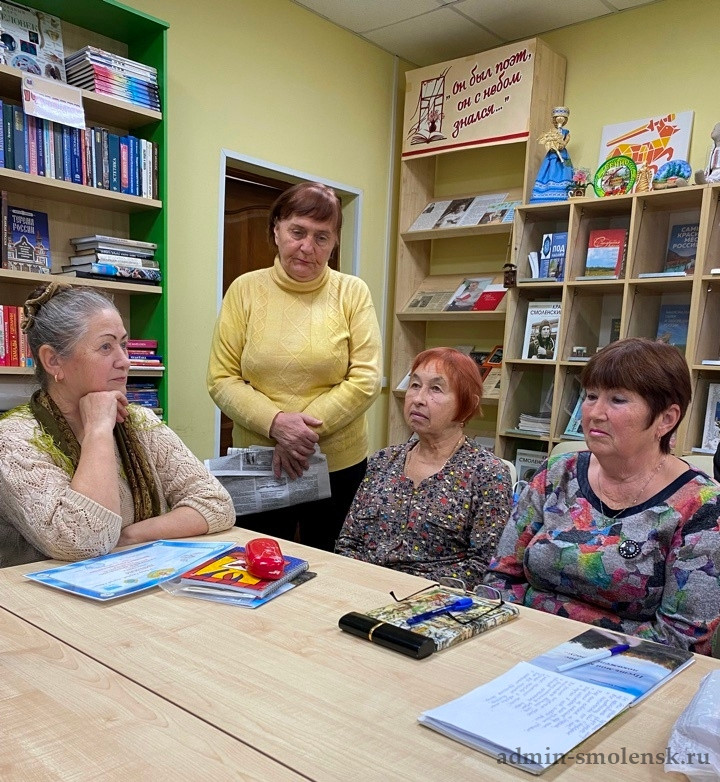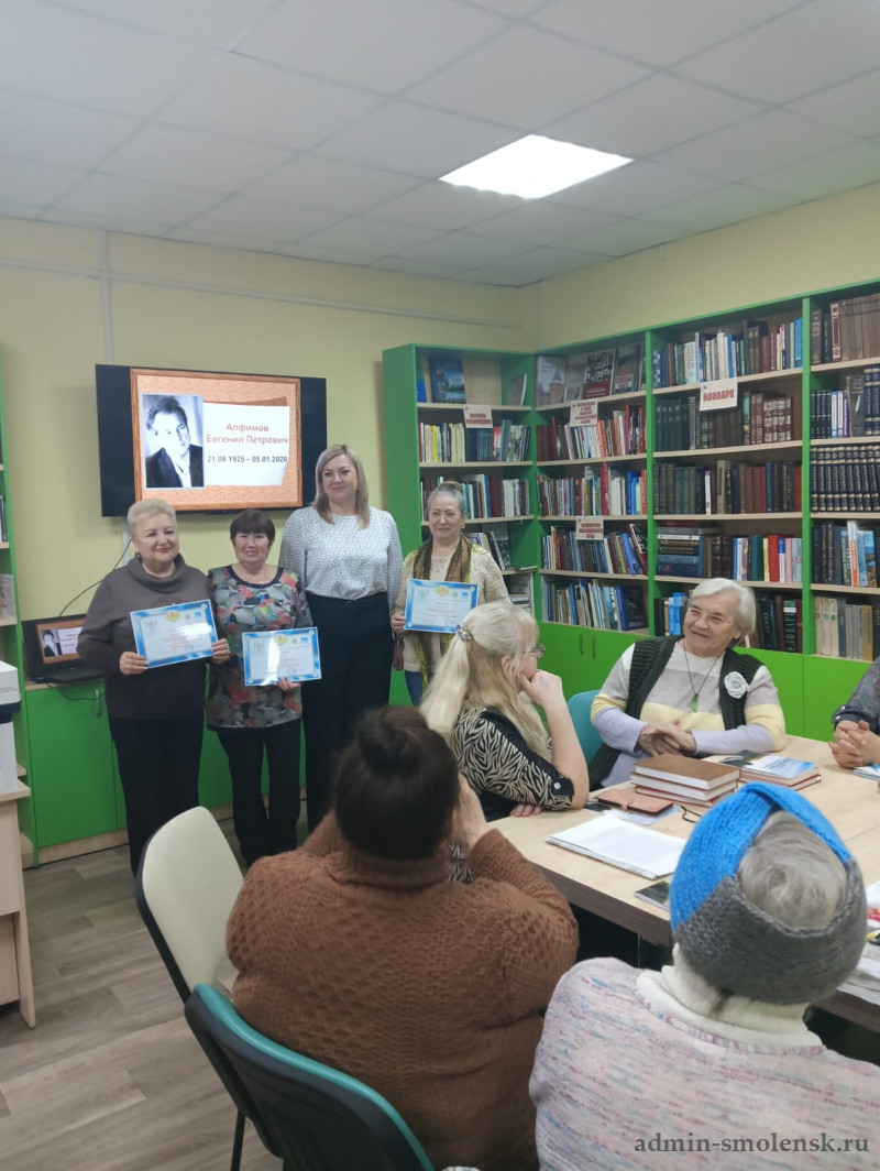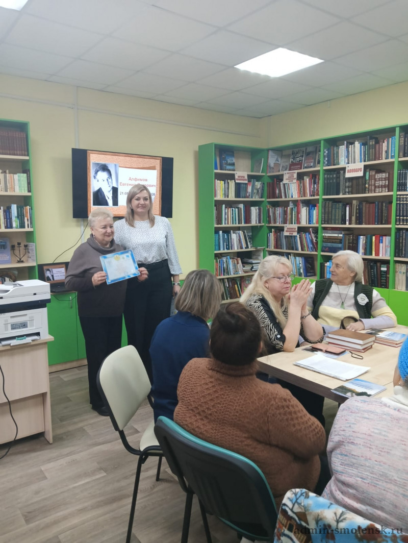 12 ноября в центральной районной библиотеке им. В.П. Смирнова прошло очередное заседание районного литературного объединения «Слово». Его первая часть была посвящена жизни и творчеству замечательного писателя и поэта Евгения Петровича Алфимова, которому в августе 2025 года исполнилось 100 лет. Стихи и отрывки прозы прочитали Ирина Бенделиани, Татьяна Атрохова, Наталья Мазурова, Тамара Ковалева. Наталья Толбатова и Валентина Алексеевна Станкевич рассказали о личных встречах с выдающимся смоленским писателем.